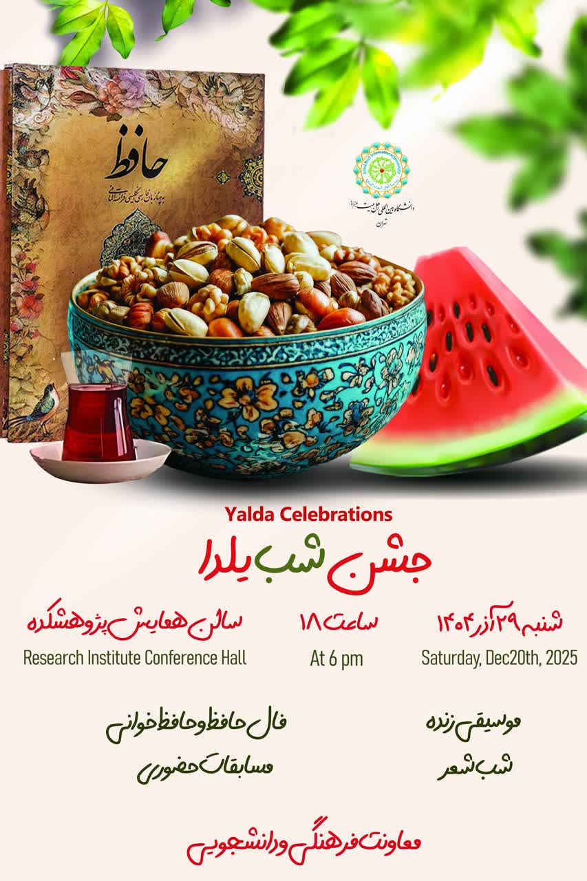 جشن شب یلدا Yalda Celebrations شنبه ۲۹ آذر ۱۴۰۴ ساعت ۱۸ Saturday, Dec20th, 2025 at 6 pm سالن همایش پژوهشکده Research Institute Conference Hall موسیقی زنده Live Music مسابقات حضوری In-person competitions شب شعر Poetry Night فال حافظ و حافظ …